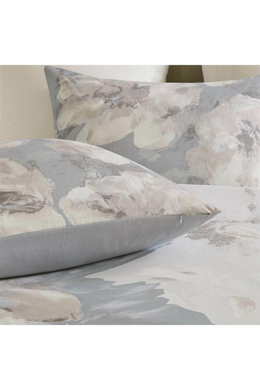Comforter and sham face: cotton sateen metallic panel printed. Back: cotton percale solid. 100% poly fill. Hidden bartacking.Â