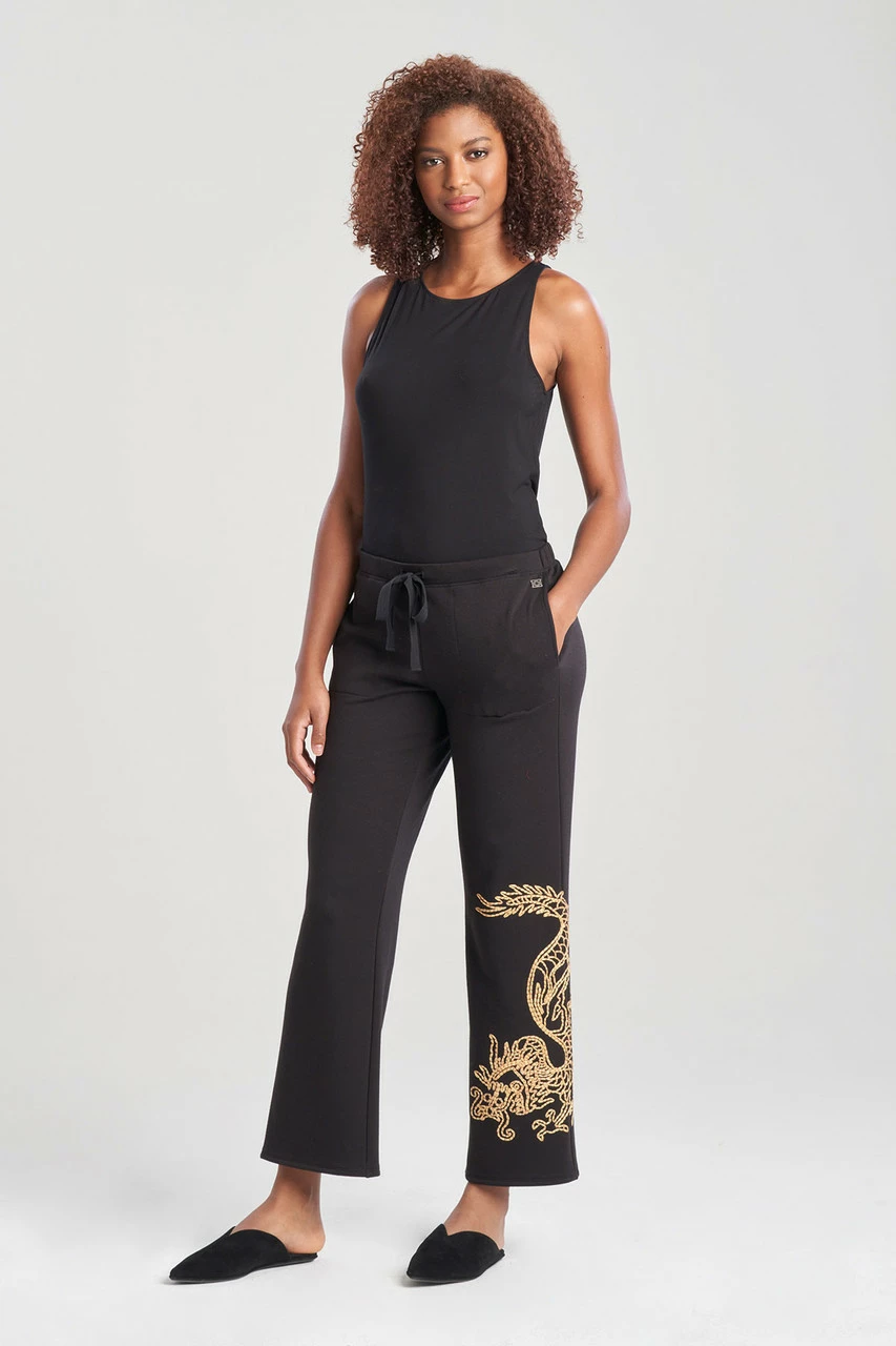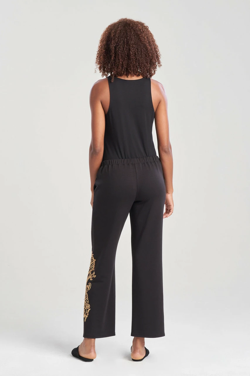 - Straight leg pant with an elastic waistband and drawstring and side seam pockets. Unique and beautiful embroidery on right bottom leg