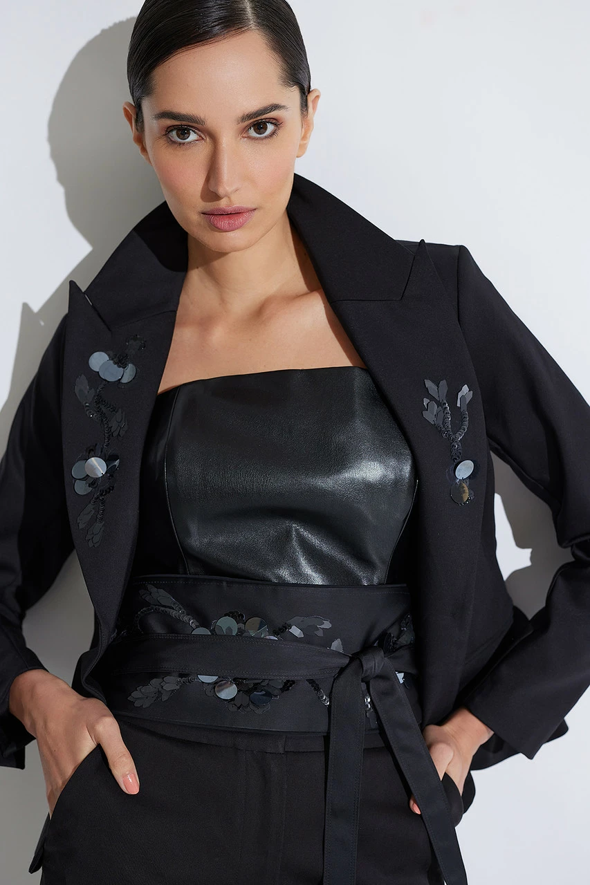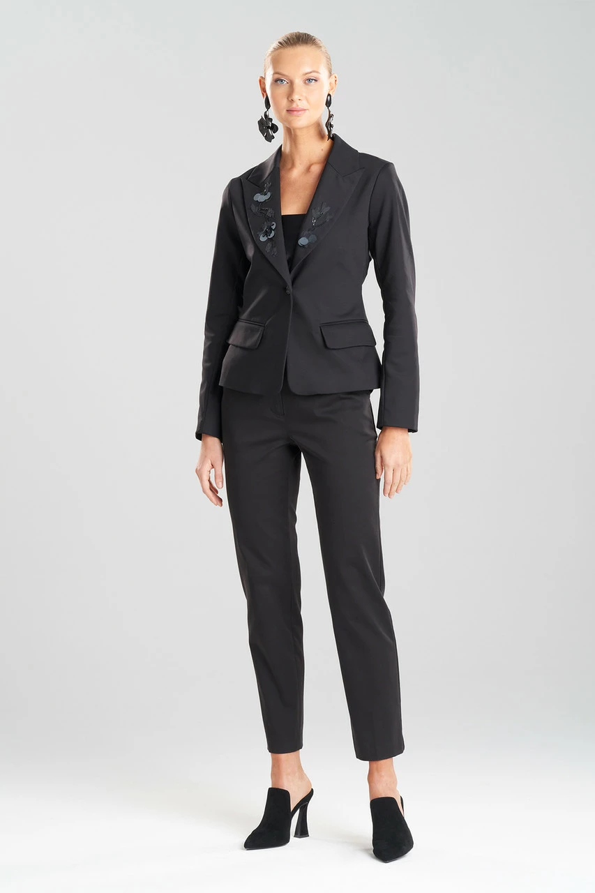 - Fully lined structured blazer with beading on the lapel and a 1 button closure on the center front