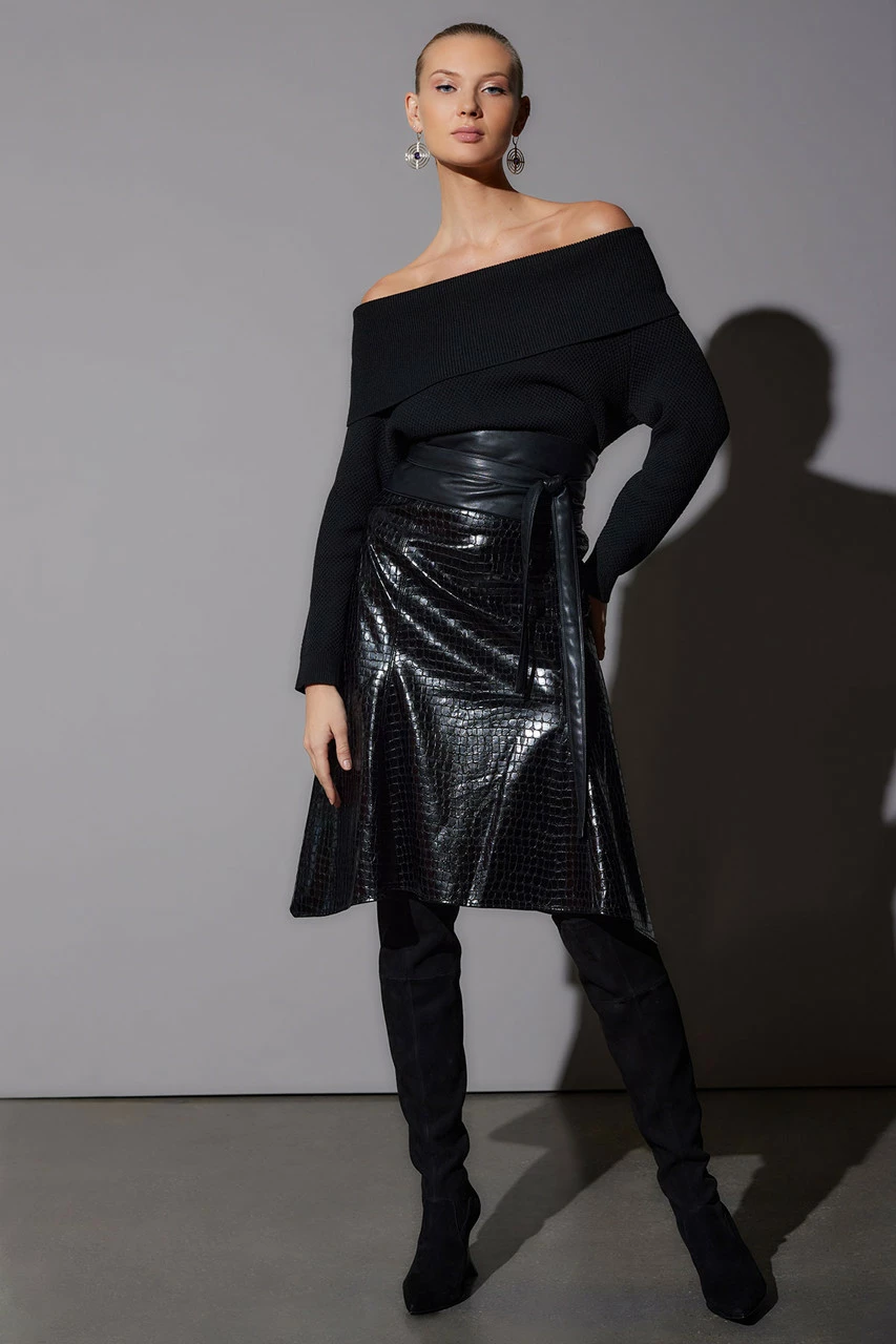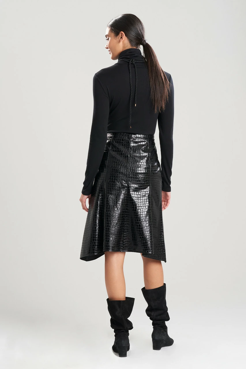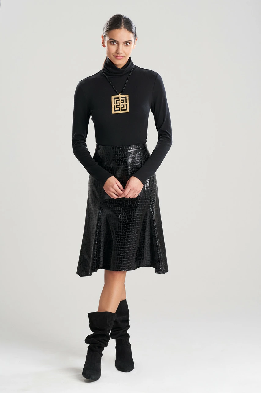 - Feminine trumpet skirt that is slim around waist and flares out below hip