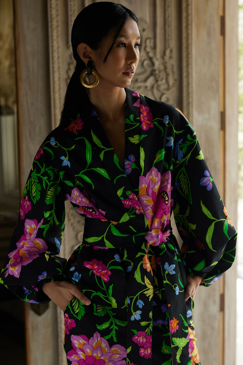 - Topped with collar band, balloon sleeves, and self tie in the front