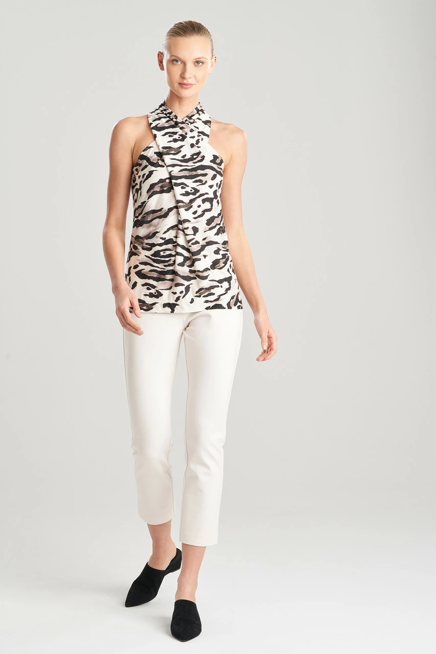 - Halter neck tank that accentuates the collar bone for an elevated look