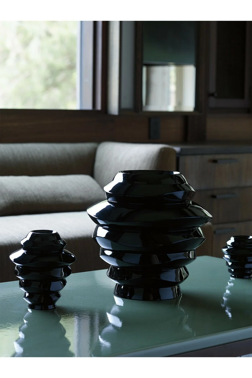 A collection of vases made from Marmorcast, a high-grade scratch-resistant polymer molded in a unique spiral concept and finished in high-gloss piano black