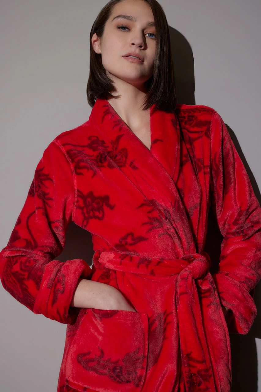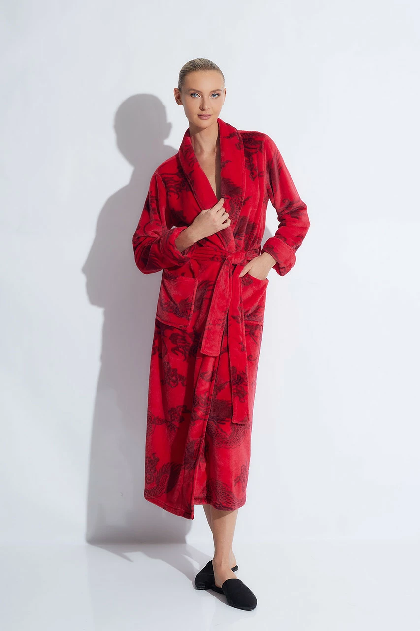 Our plush printed micro velour robe has an extra soft and cozy handfeel. Featuring our iconic dragon pattern. The perfect one-of-a-kind gift.