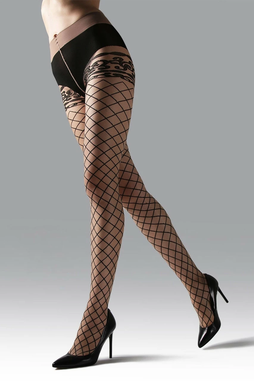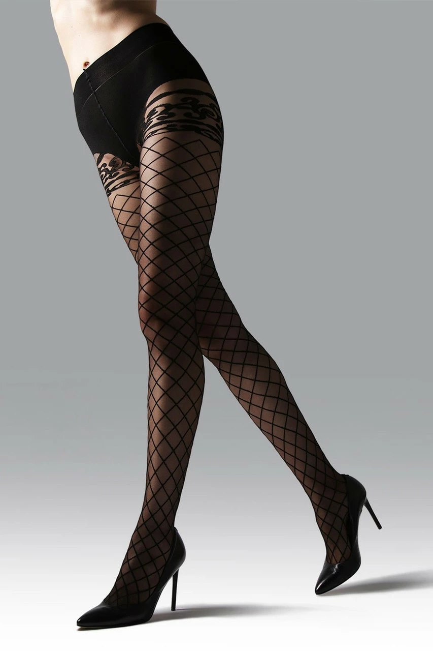 Sheer tights with the look of fish nets, and scroll detailing for added flair.