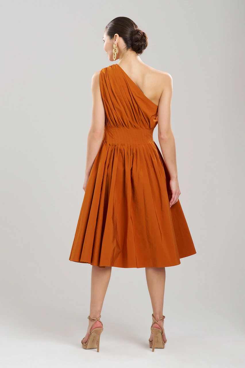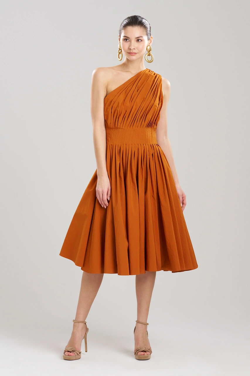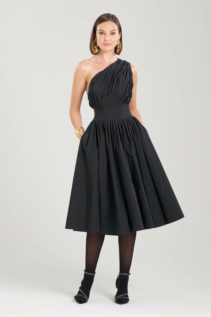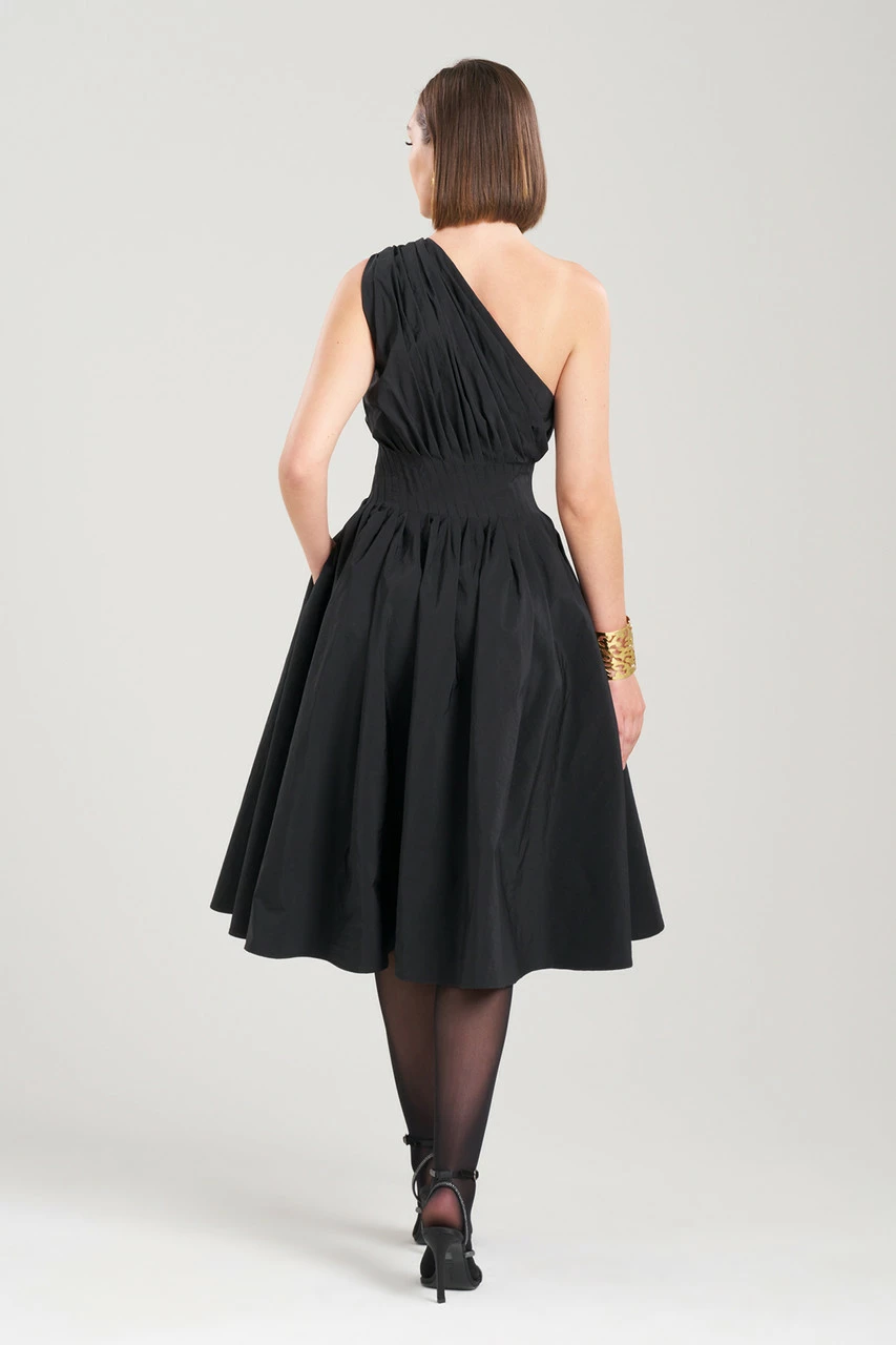 - A-line dress, one shoulder, pleated detailing, invisible zipper