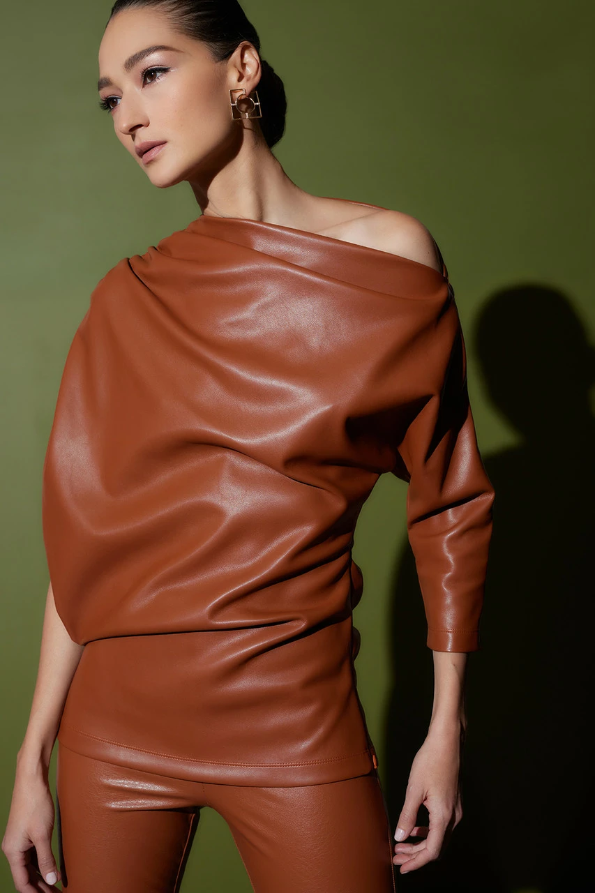 - 100% vegan leather top with ruching detail on wearer’s right side with an invisible zipper