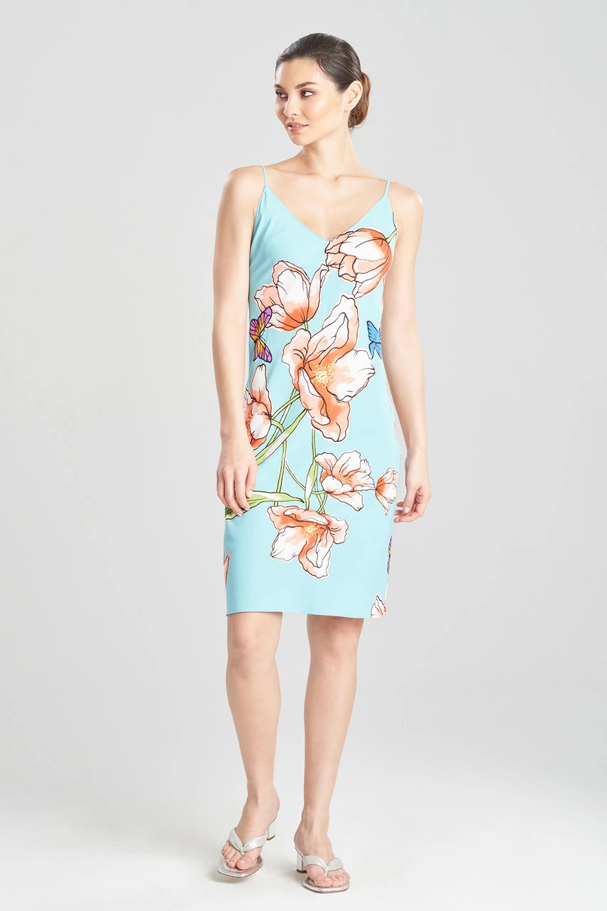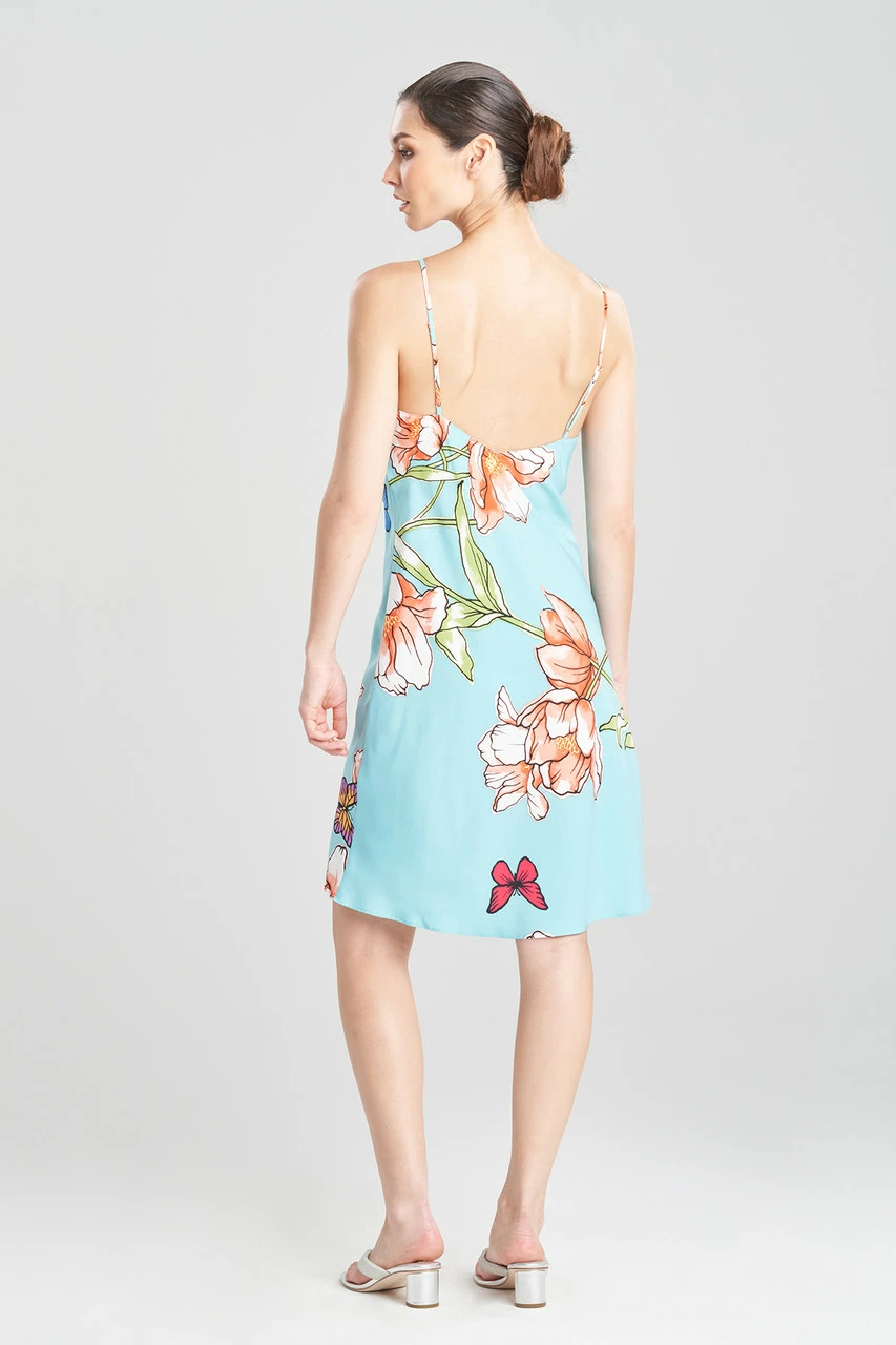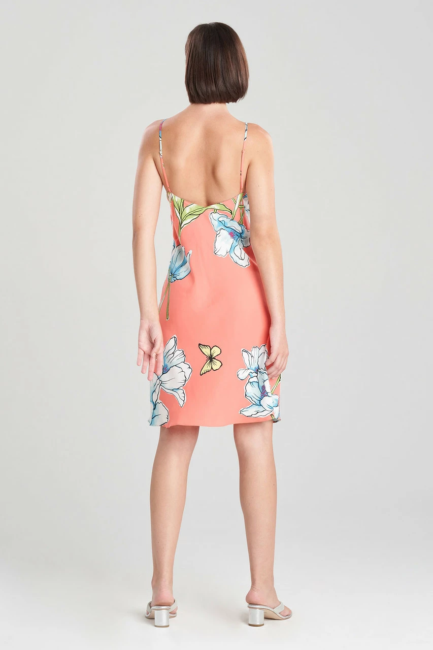 Slip into the dramatic floral and butterfly printed charmeuse.